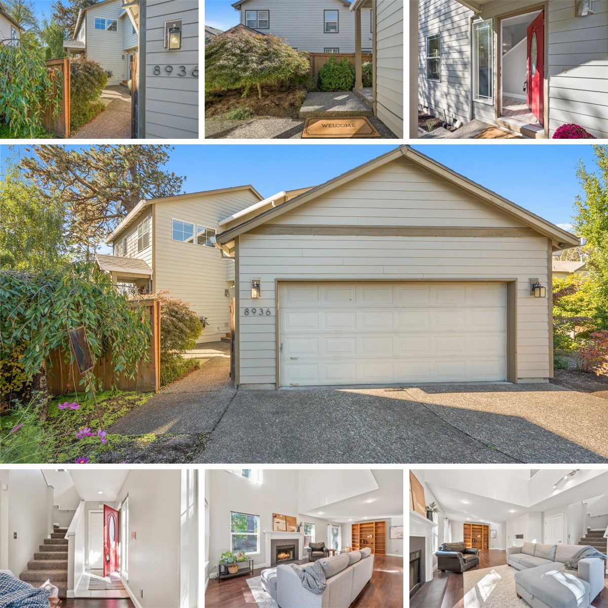 Tucked away in a close-in SW Portland/Tigard neighborhood, this light-filled townhome has sophisticated style, and is incredibly spacious. The fantastic floorplan, huge yard and excellent privacy rivals most single-family homes! When you first come inside, the living room with a vaulted ceiling will exceed all expectations - it's a fantastic living area with two stories of windows that frame the trees & sky, and let in SO MUCH natural light. Such a bright, open atmosphere that lives much larger than you'd expect. The living and dining areas are wide open, great for entertaining, with a slider onto the deck and huge backyard. A rare and coveted wood-burning fireplace for cozy evenings with a crackling fire. Nearly every window provides a view of the nature and mature landscape that surrounds this home. Crisp white kitchen with granite counters, induction stove, stainless appliances (all appliances included!) plus a pass-through to the living room, and great storage with pantry and broom closet. Each of the two excellent primary suites includes its own full bath and walk-in closets with organizers; ideal for guests, roommates, or a home office setup. This may be the most impressive backyard you've seen in a townhome; a generous deck, plenty of sun & space for gardening, fully fenced, deck for summer BBQ's, enjoy private mornings & evenings surrounded by trees. Generous two-car garage. Laundry room on main floor (washer & dryer included!) New roof, new carpet and new paint done in 2020. New water heater in 2023. A location that feels like a park, but very central to all things Portland - just moments from trails, restaurants, and golf course. A perfect blend of space, light, affordability, livability — an absolutely ideal, move-in ready home for the buyer looking for both privacy and community. HOA dues $40/month (covers neighborhood landscaping and neighborhood common area costs.)